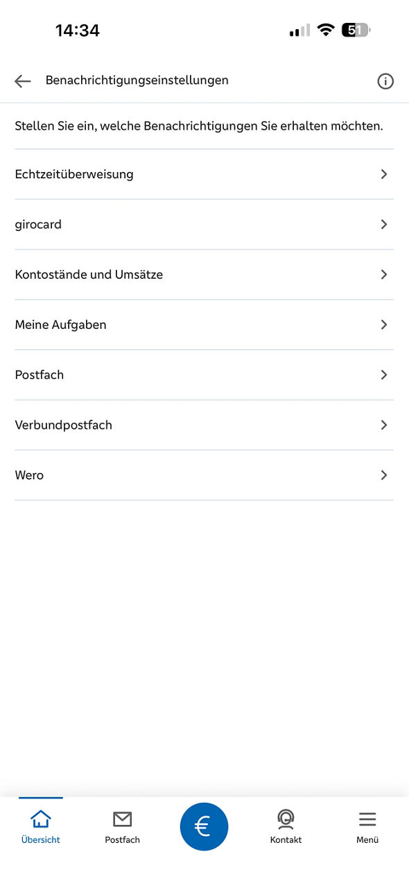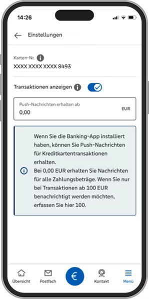 Bitte beachten Sie bei girocard-Zahlungen: Bei kleineren Beträgen kann es vorkommen, dass die Zahlung als sogenannte Offline-Transaktion erfolgt. In solchen Fällen wird keine Push-Benachrichtigung ausgelöst. Dies ist beispielsweise bei Zahlungen an Parkautomaten möglich.